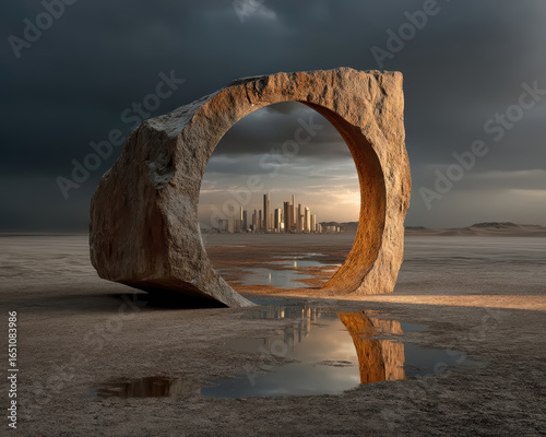 © Дмитрий Сирота, Fototapeta premium Hyper-realistic animation circular stone arch with reflective mirror in desert
