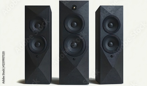 © Milana, Obraz premium Hyper-Realistic Black Speakers in Dynamic Composition with Dramatic Lighting