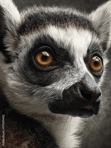 Obraz premium Hyper realistic close up of lemur with large round eyes and striped fur in lifelike wildlife portrait
