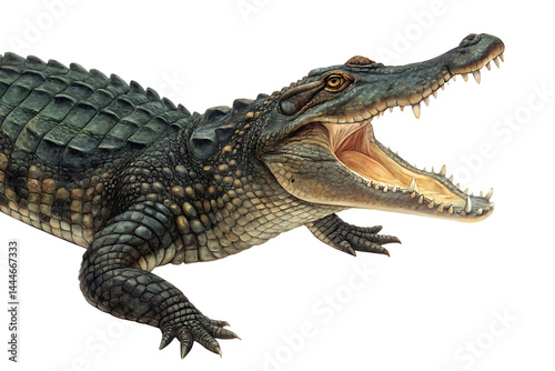 Naklejka premium Hyper-Realistic Crocodile Depiction – Detailed Teeth and Scales on White...