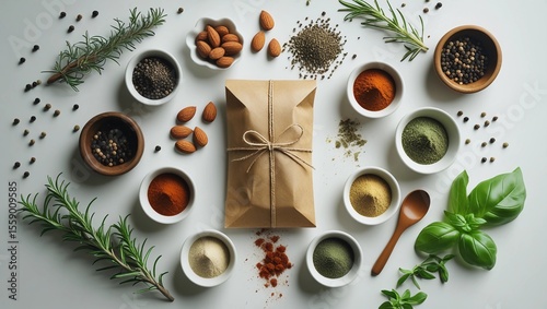 © Ruchira, Obraz premium Hyper-Realistic Flat Lay of Assorted Spices, Herbs, and Rustic Brown Paper Package