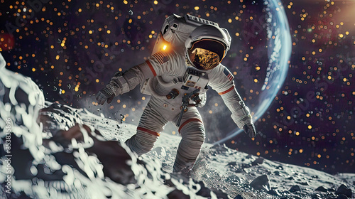 Obraz premium Hyper-realistic image of an astronaut starting to run on a lunar surface detailed space suit lighting starry high-tech space exploration