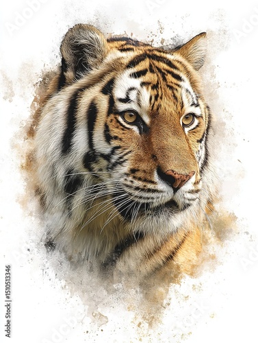 Fototapeta premium Hyper-realistic portrait of a Siberian tiger with vibrant watercolor splashes...