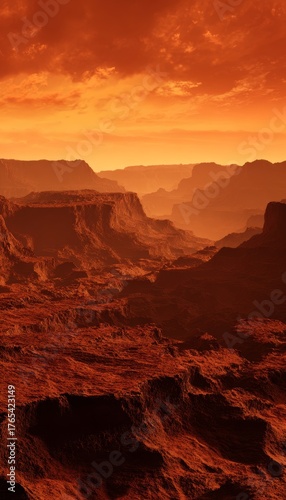 Naklejka premium Hyper realistic red canyons under a fiery orange sky with rolling dust clouds and dramatic shadows