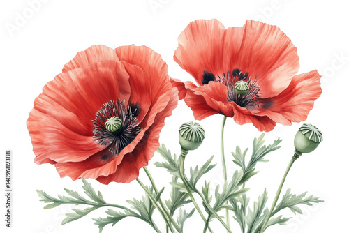 © Мария Охметзянова, Obraz premium Hyper-realistic red poppy flower with delicate crinkled petals and green seed pod, isolated on white background, botanical illustration