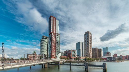 © HyperlapsePro, Fototapeta premium Hyperlapse of the Rijnhaven Bridge with skyscrapers in Rotterdam, Netherlands.