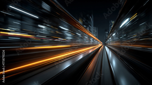 Obraz premium Hyperrealistic abstract view of a subway tunnel with dynamic light trails, illustrating motion, speed, and futuristic urban transit energy.