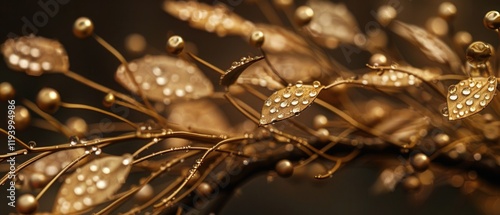 © Elzerl, Fototapeta premium Hyperrealistic golden laurel wreath. Morning dew glistens on each leaf. Botanical detail exquisite. Natural lighting enhances the gold.