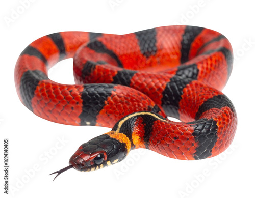 © Abhi, Naklejka premium Hyperrealistic image of a vibrant red and black coral snake with glossy scales, isolated PNG