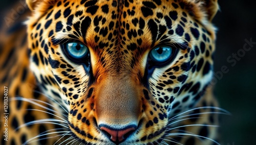Fototapeta premium Hyperrealistic leopard portrait, intense blue eyes, detailed fur texture,...