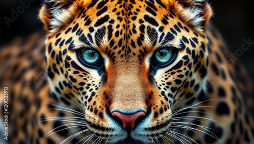 Fototapeta premium Hyperrealistic leopard portrait, intense blue eyes, detailed fur texture,...