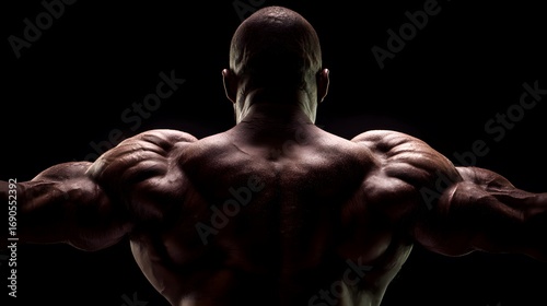 © Eniko, Fototapeta premium Hyperrealistic Muscular Male Displaying Prominent Back Muscles Under Dramatic Lighting on a Deep Black Background with Intense Detail and Definition