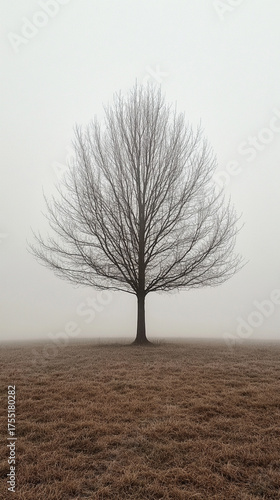 Fototapeta premium Hyperrealistic scene of a solitary tree standing in a foggy meadow with soft...