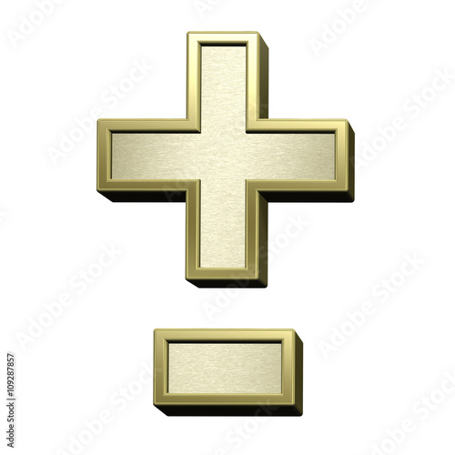 © Piotr Pawinski, Obraz premium Hyphen, minus, plus marks from brushed gold with shiny frame alphabet set, isolated on white. 3D illustration.