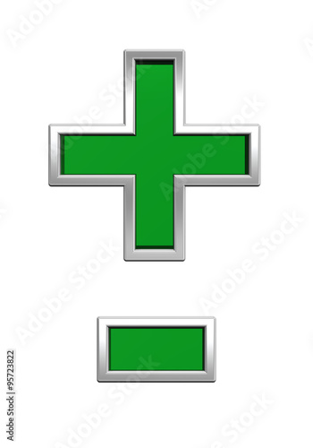 © Piotr Pawinski, Fototapeta premium Hyphen, minus, plus marks from green glass with chrome frame alphabet set, isolated on white. Computer generated 3D photo rendering.