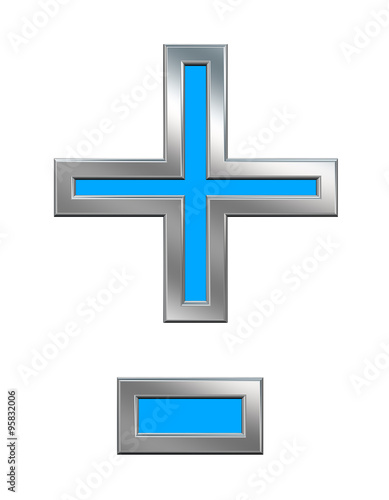© Piotr Pawinski, Obraz premium Hyphen, minus, plus marks from light blue with chrome frame alphabet set, isolated on white. Computer generated 3D photo rendering.