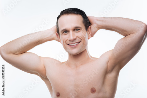 Fototapeta premium I feel comfortable. Happy positive good looking man holding his hands behind...