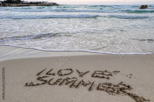 © Massimo Todaro, Fototapeta premium I love summer written on the sand in a beach in the middle of winter on the coast of Taranto, Puglia, Italy