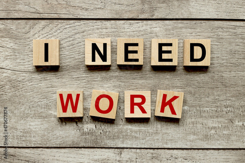 Fototapeta premium I NEED WORK. wooden cubes on a wooden background. three wood blocks