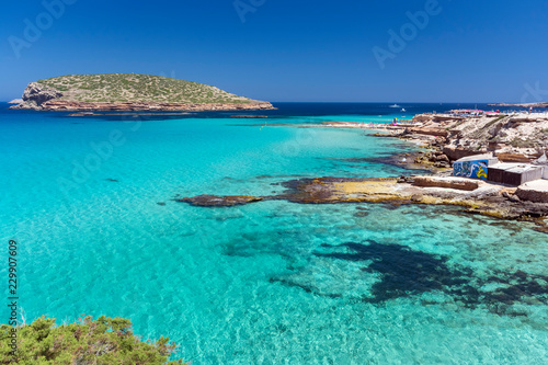 Fototapeta premium Ibiza - Cala Comte, Blick auf die Cala Escondida und über das Meer zur Cala Comte mit der Insel Illa des Bosc