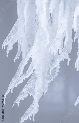 © Ivan, Fototapeta premium Ice and icicle formation. Beautiful shape of a melting icicle. Crooked icicles, vertical image