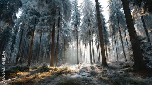 Obraz premium Ice-Covered Forest Bathed in Morning Light with Ethereal Atmosphere