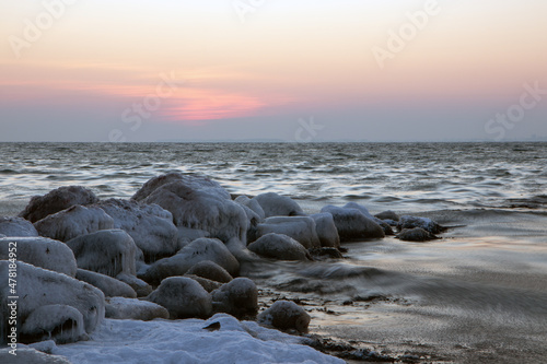 © Lars Gieger, Obraz premium ice covered stones by the sea in winter.