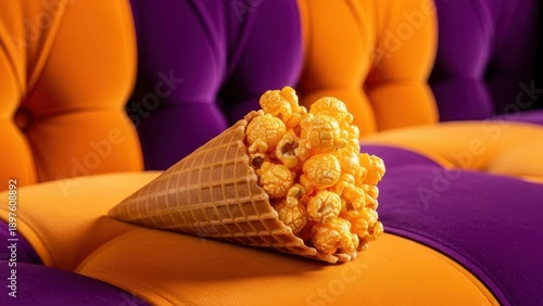 © IM, Fototapeta premium Ice cream waffle cone filled with golden caramel popcorn on purple and orange tufted sofa