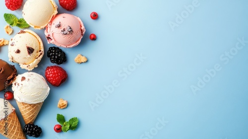 Fototapeta premium Ice cream with toppings on blue background, clean top space for headline