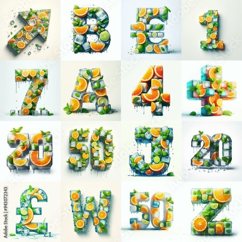 Obraz premium Ice cubes and mints and citrus Lettering Typeface. AI generated illustration