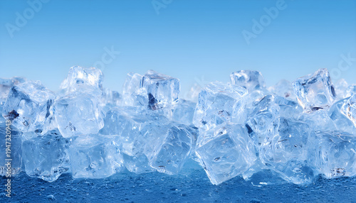 © Oleksiy, Obraz premium Ice cubes border ice background blue.