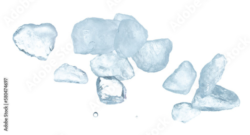 © Jade, Naklejka premium Ice Cubes explosion flying, crystal clear ice wave floating, fall down in air. Ice Brick block cube is frozen water healthy thirsty. White background Isolated high speed shutter, freeze stop motion