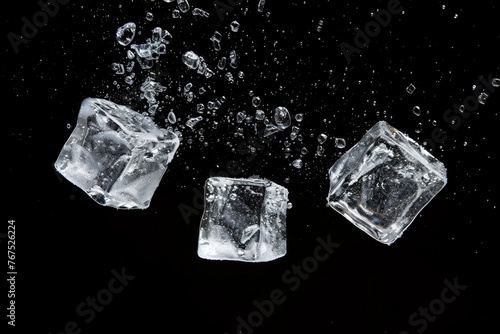 Obraz premium Ice cubes falling with water splashes on a black background.