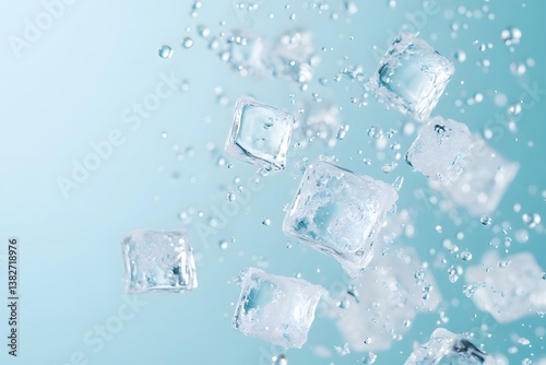 © Chanchira, Obraz premium Ice cubes flying on blue background
