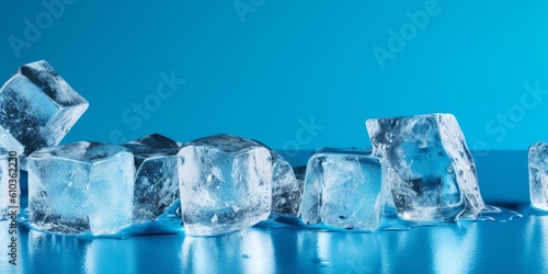 Obraz premium Ice cubes on a blue background, side view. Generative AI