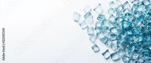 © abu, Fototapeta premium Ice cubes scattered on white background, refreshing drink concept