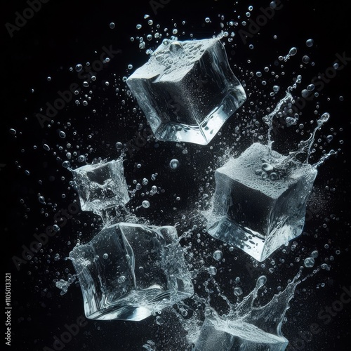 © Vladimir Steblev, Obraz premium ice cubes with water particles splash in motion air, on black background for overlay