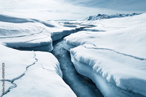 Obraz premium Ice formations and river flowing through snow-covered landscape, serene...