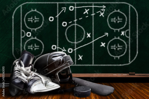 Naklejka premium Ice Hockey Equipment and Chalk Board Play Strategy