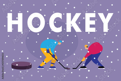 Fototapeta premium Ice Hockey Players Competing in Winter Snowy Outdoor Match 2d flat vector illustrations