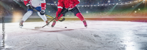 Naklejka premium Ice hockey players on the grand ice arena. A game in the ice hockey hall.