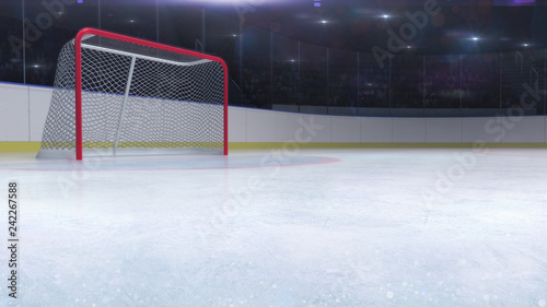 Fototapeta premium ice hockey stadium with goal red gate and blank copy space front, hockey and skating stadium indoor 3D render illustration background