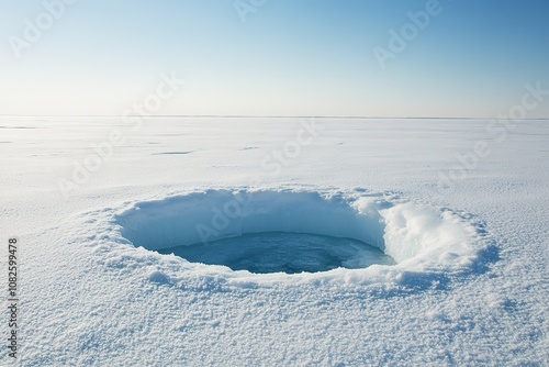 © Сергей Захаров, Obraz premium Ice hole in frozen landscape under blue sky