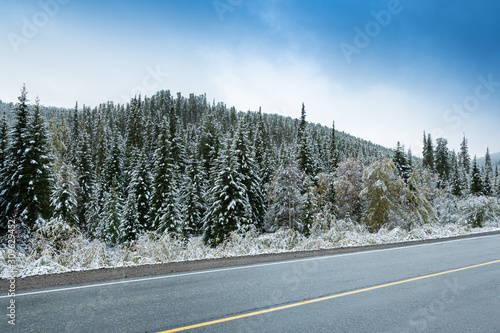 Naklejka premium ice on winter asphalt road, road trip to mountains, roadbed in woods,...
