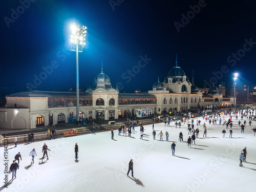 © Geza Kurka, Obraz premium Ice rink in the heart of Budapest, Hungary. Every year all winter time open and popular sport activity for tourists and citizens. Hungarian name is Varosligeti mulyegpalya.