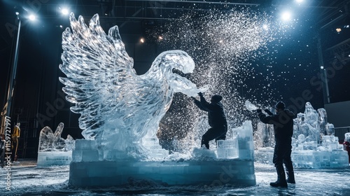 © lanych, Fototapeta premium Ice sculpture carving, Ice Art Championships, winter art