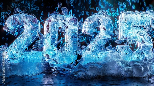 Fototapeta premium Ice Sculpture of 2025 Against a Dark Background With Blue Numbers