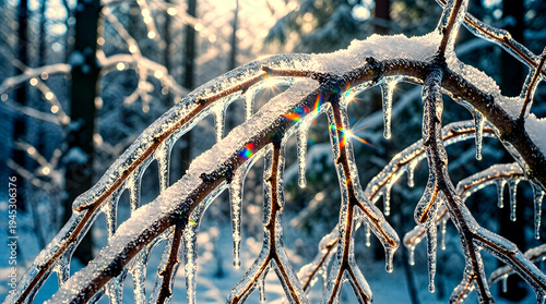 © Pragati, Obraz premium Ice Storm Aftermath with Every Tree Branch and Surface Coated in Thick Clear Ice Glaze Winter Forest Cold Blue-White Light Prismatic Rainbow