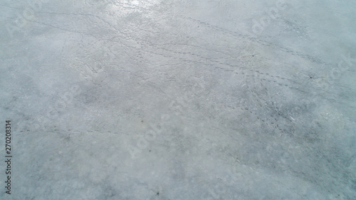 Naklejka premium ice surface on the water in the spring with traces of fishermen and people