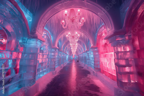 © EdvvinStudios, Obraz premium Ice tunnel glowing with pink and blue lights